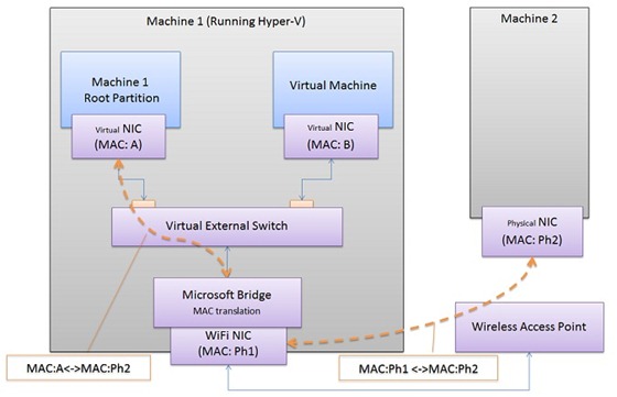 Con le dovute semplificazioni e in estrema sintesi la questione da risolvere è la seguente: supponiamo di avere due o più macchine virtuali in esecuzione con Hyper-V e che ognuna di esse abbia almeno un'interfaccia di rete. Ad ogni interfaccia di rete viene associato un MAC address che sarà trasferito in ogni pacchetto di dati. Nel caso di una soluzione server con interfaccia ethernet l'utilizzo di un NIC in promiscuous mode rende possibile la comunicazione delle schede virtuali con il mondo reale, ma altrettanta flessibilità non è offerta dai NIC utilizzati per la connezzione Wi-Fi che supportano solo singoli MAC address nei pacchetti.